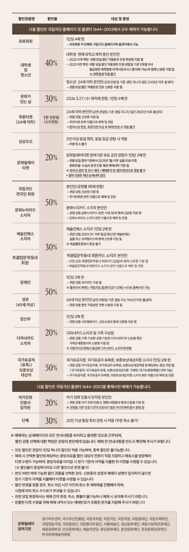▶ 다음 할인은 국립극단 홈페이지 및 콜센터 1644-2003에서 모두 예매가 가능합니다. |